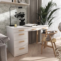 Первое, на что обращают внимание родители при выборе письменного стола, — это его дизайн. Однако здесь важно не переусердствовать с яркими цветами и броскими деталями. Лучше отдать предпочтение нейтральным оттенкам: белому, бежевому, светло-серому или пастельным тонам. Такие цвета не раздражают глаза, не отвлекают от занятий и благоприятно влияют на психику ребенка, создавая спокойную атмосферу для учебы.